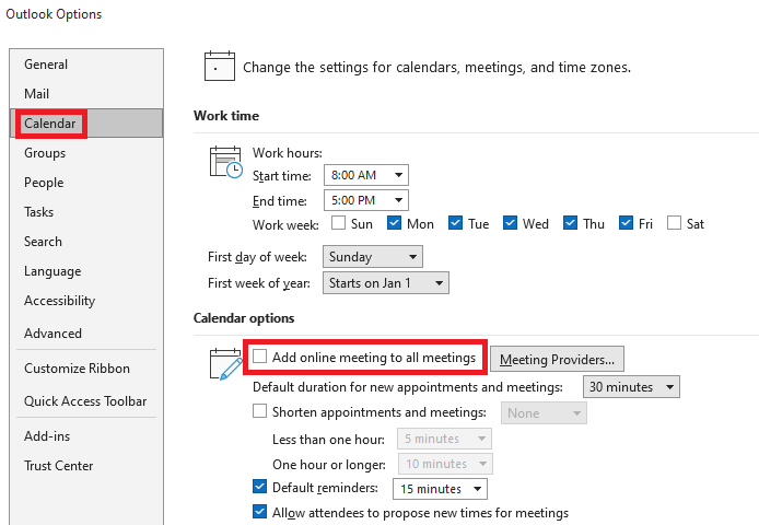 Select Calendar on the left. Uncheck the checkbox next to “Add online meeting to all meetings.”