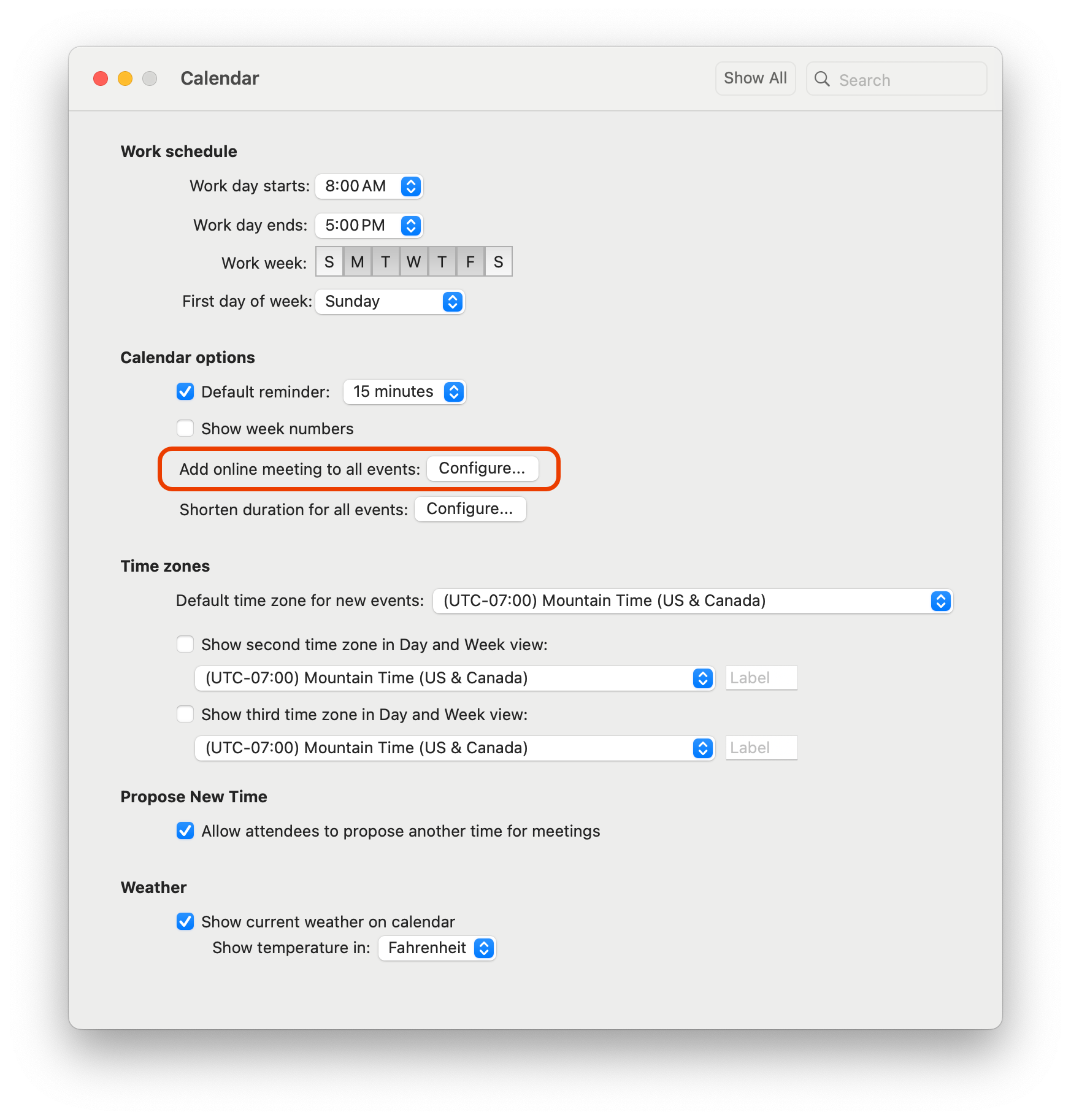 In the Calendar settings, click Configure next to the section labeled “Add online meeting to all events.”